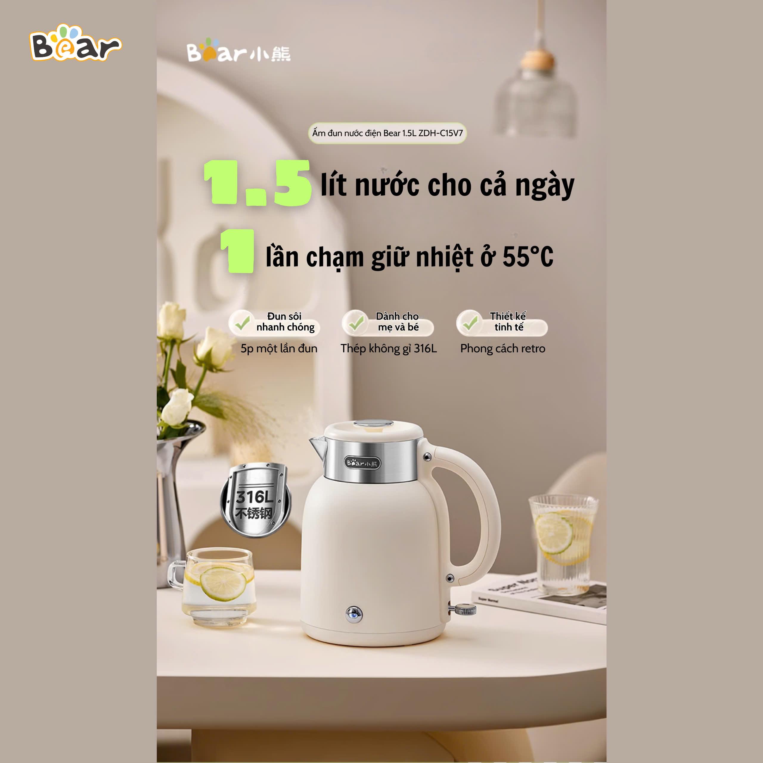 Ấm đun nước giữ nhiệt Bear ZDH-C15V7 là lựa chọn hoàn hảo cho gia đình hiện đại, giúp bạn có nước nóng nhanh chóng, an toàn và tiện lợi cho nhiều mục đích sử dụng như pha trà, pha sữa, nấu mì hay giữ ấm nước uống cả ngày.