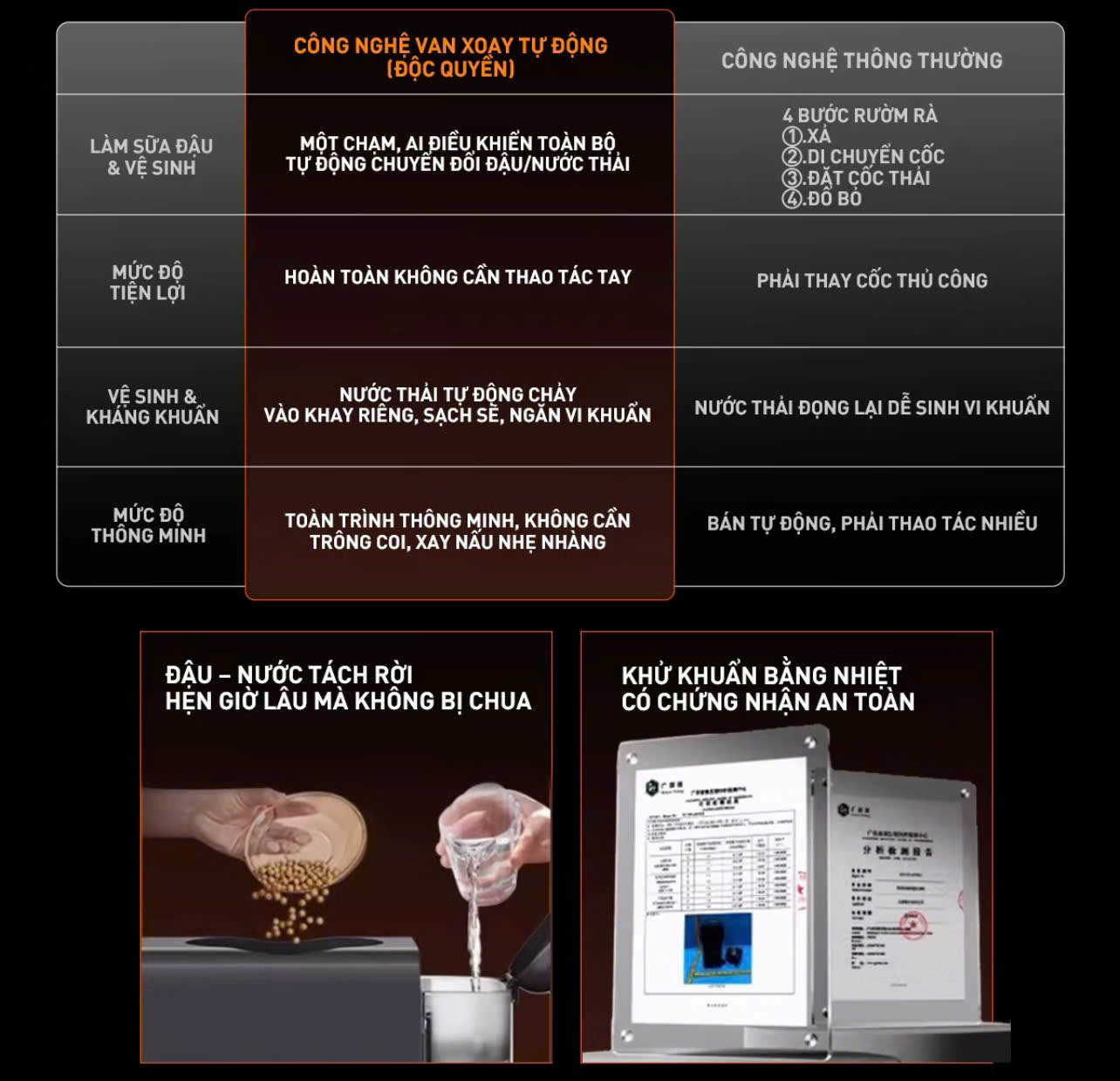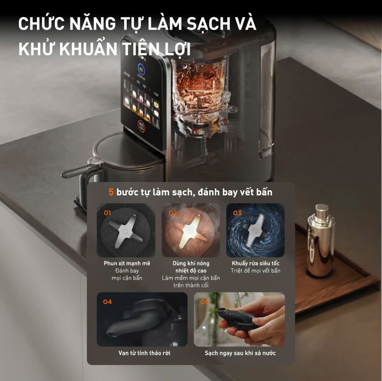 • Sau khi hoàn tất quá trình nấu, máy tự kích hoạt chế độ làm sạch, loại bỏ cặn bã, mảng bám ở thành cối và các khe kẽ.