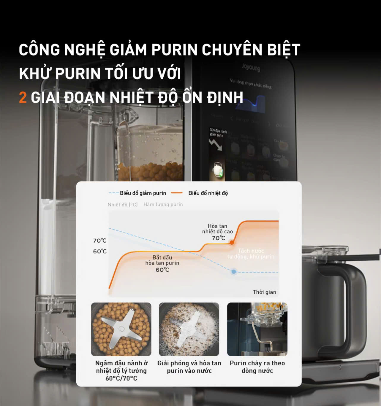 • Joyoung K7-PRO ứng dụng công nghệ giảm purin chuyên biệt với 2 giai đoạn nhiệt độ ổn định, loại bỏ lên đến 56% purin trong sữa đậu nành.