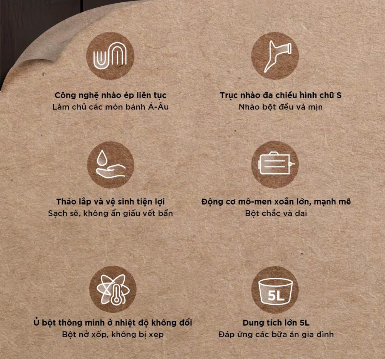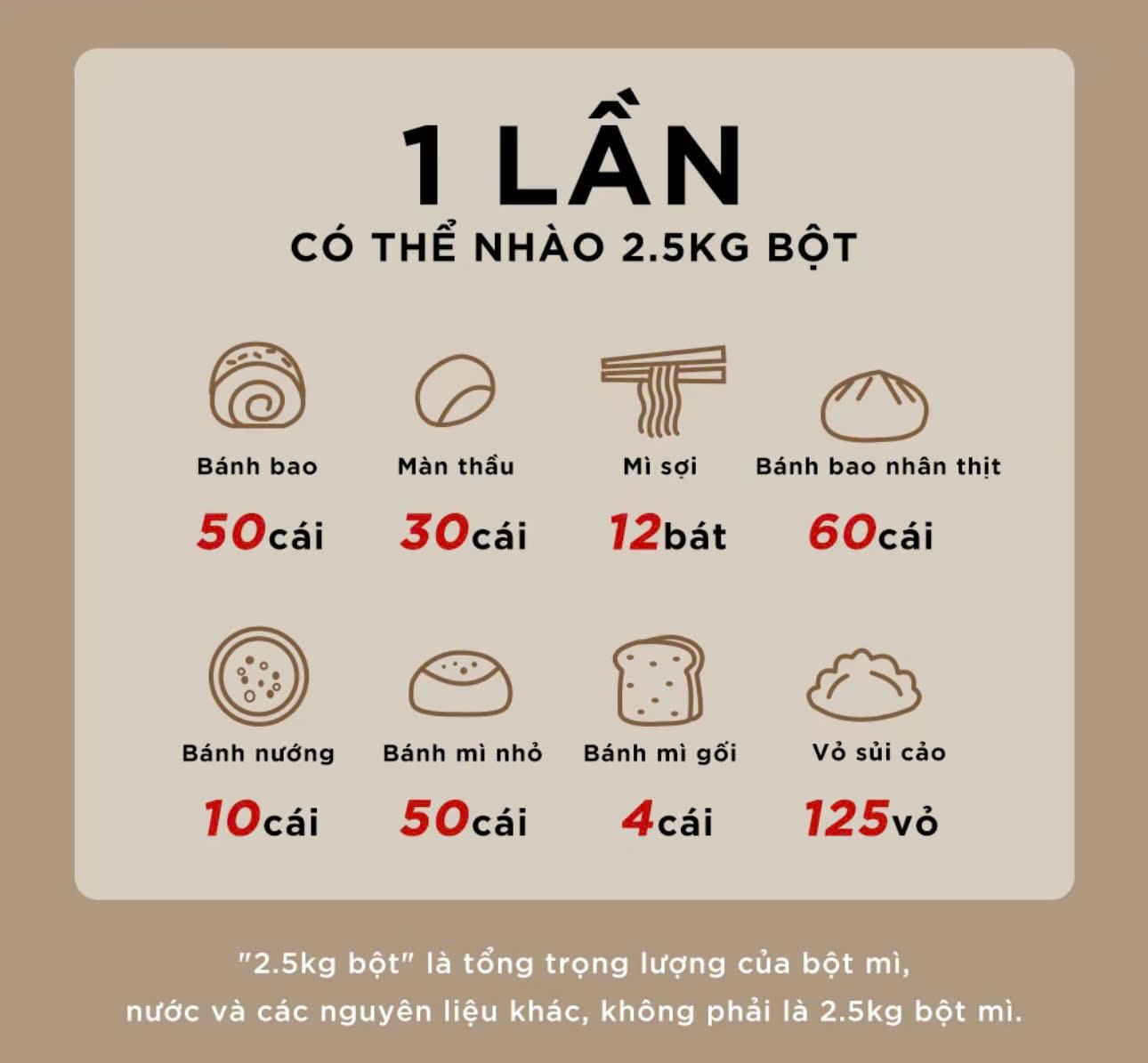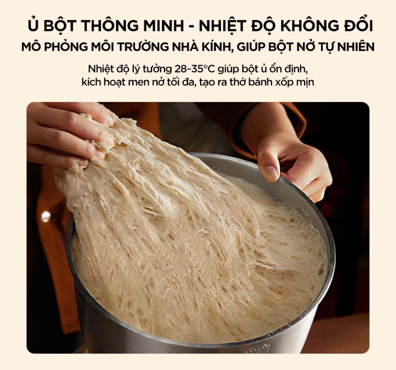 Đa năng vượt trội: Tự động nhồi và ủ bột, có chức năng hẹn giờ nhồi và nghỉ bột, giúp bạn chủ động trong mọi công đoạn.
