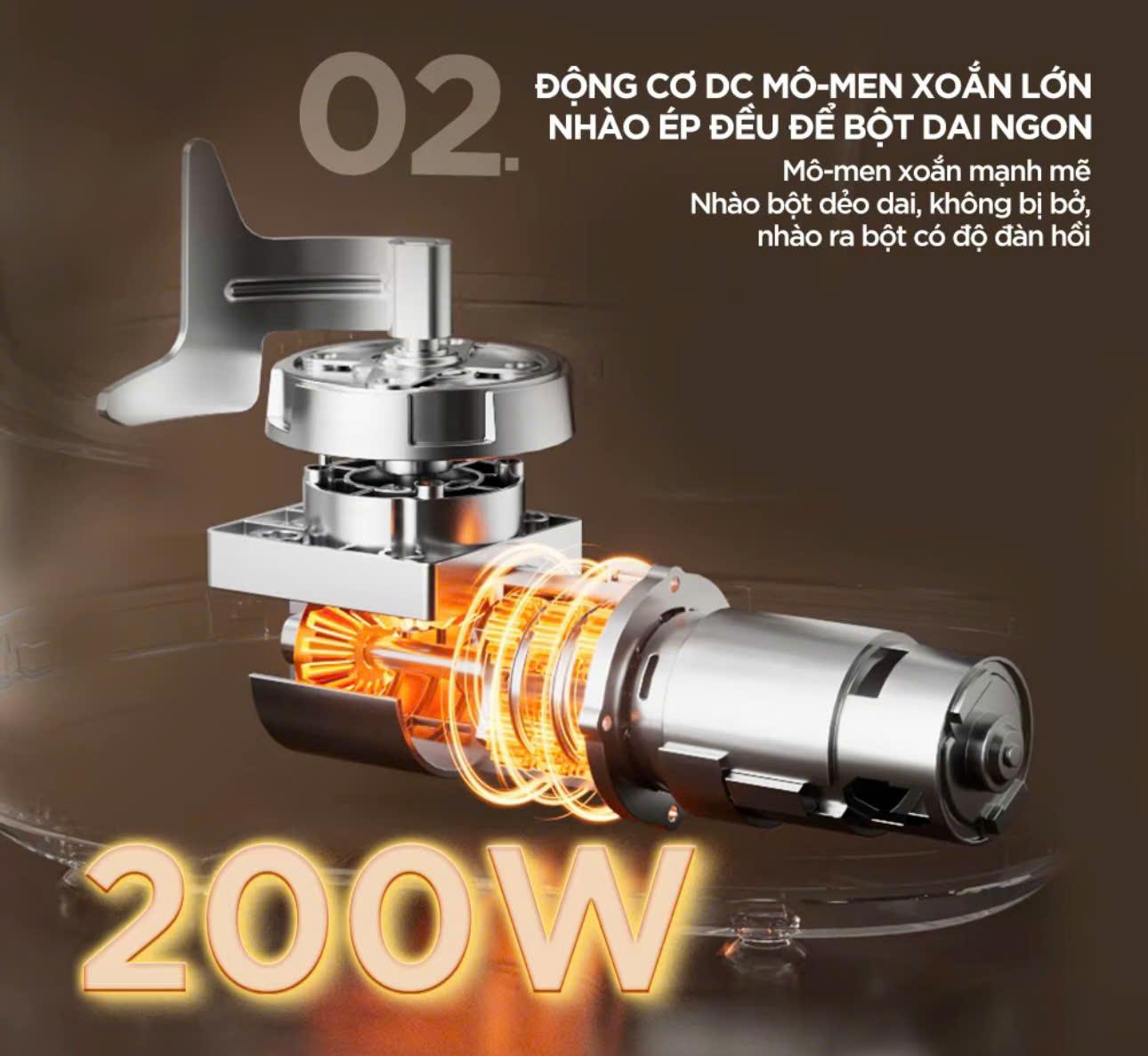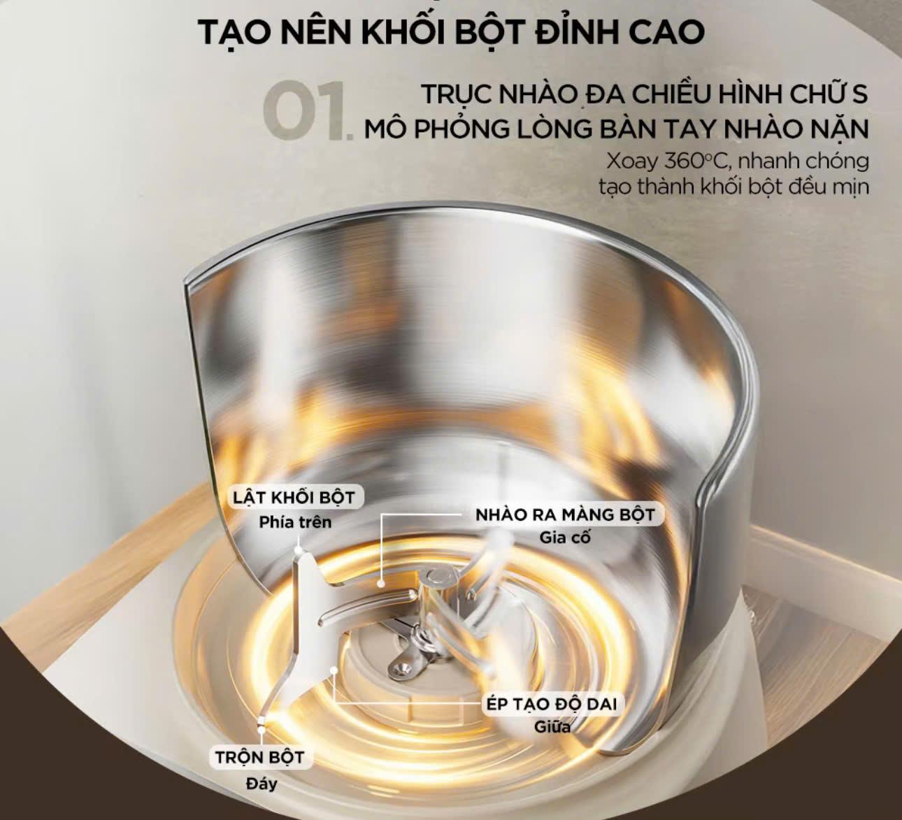 Động cơ mạnh mẽ: Lưỡi dao chữ S xoay nhanh và đều, giúp bột dẻo mịn – đạt chuẩn Gluten ngay từ lần đầu.