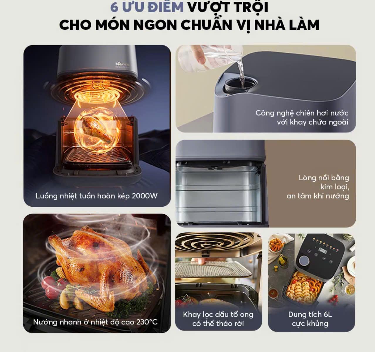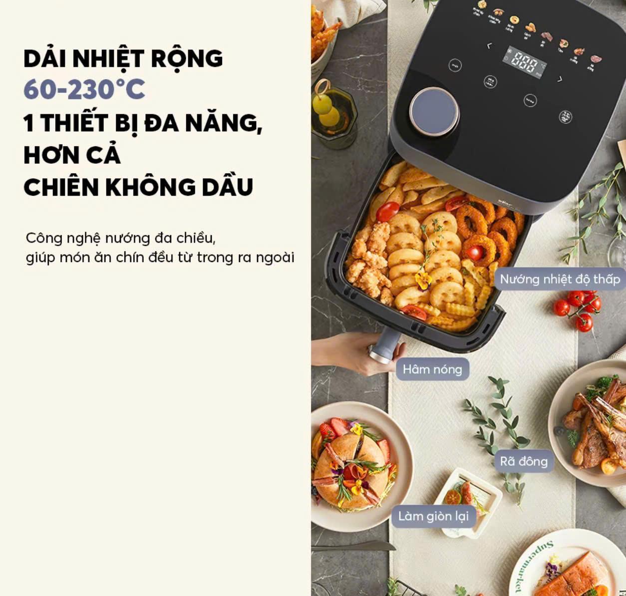 Công nghệ hơi nước kết hợp chiên không dầu: Giúp món ăn chín đều, không khô, vẫn giữ được độ ẩm và hương vị thơm ngon tự nhiên.