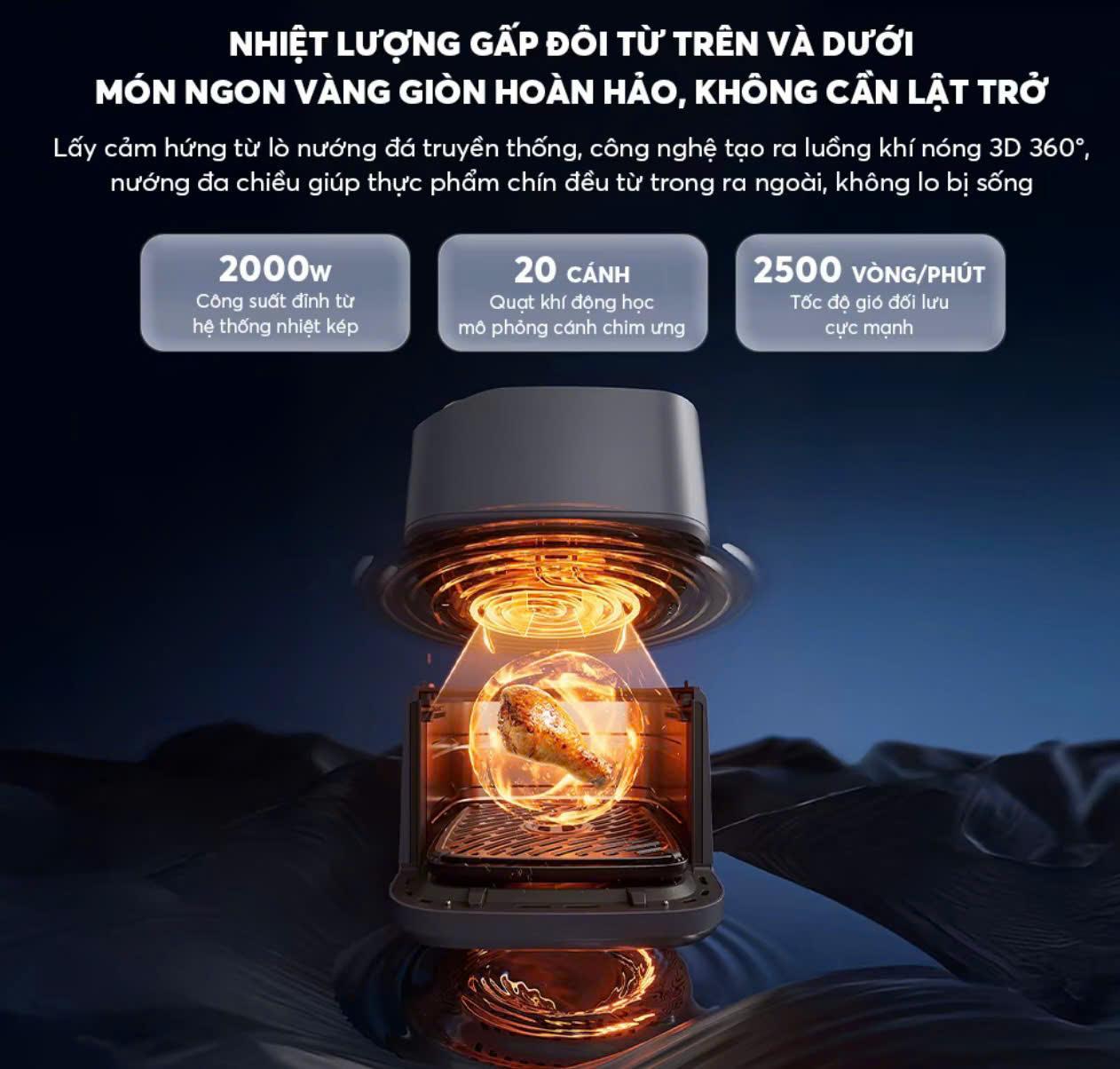 Công suất 2000W: Làm nóng nhanh, chiên nướng hiệu quả, tiết kiệm thời gian nấu nướng.