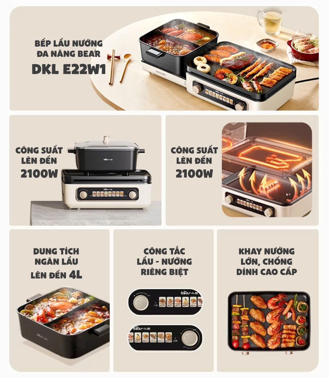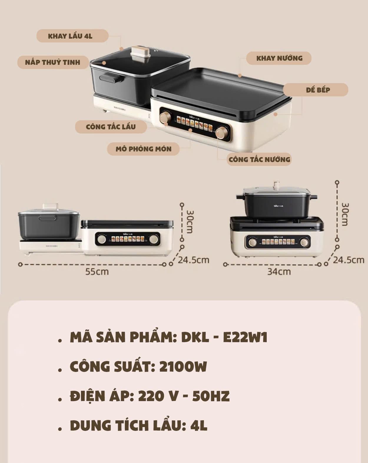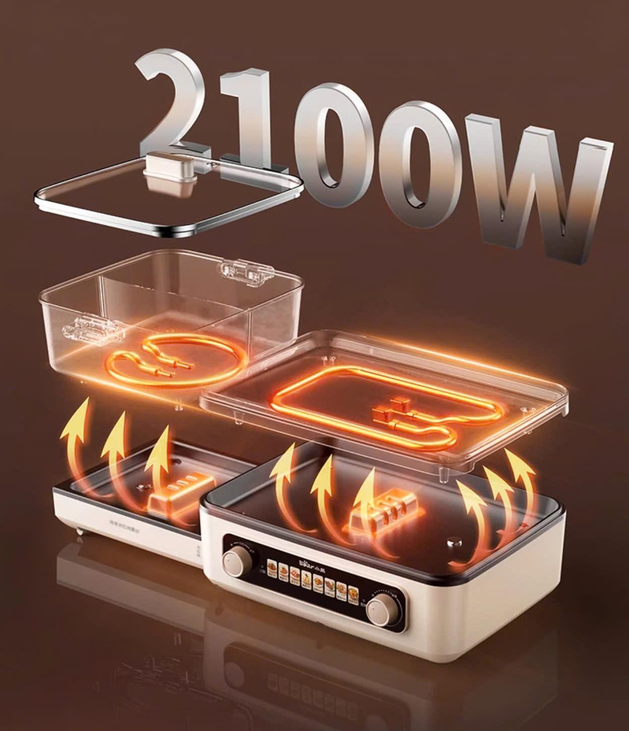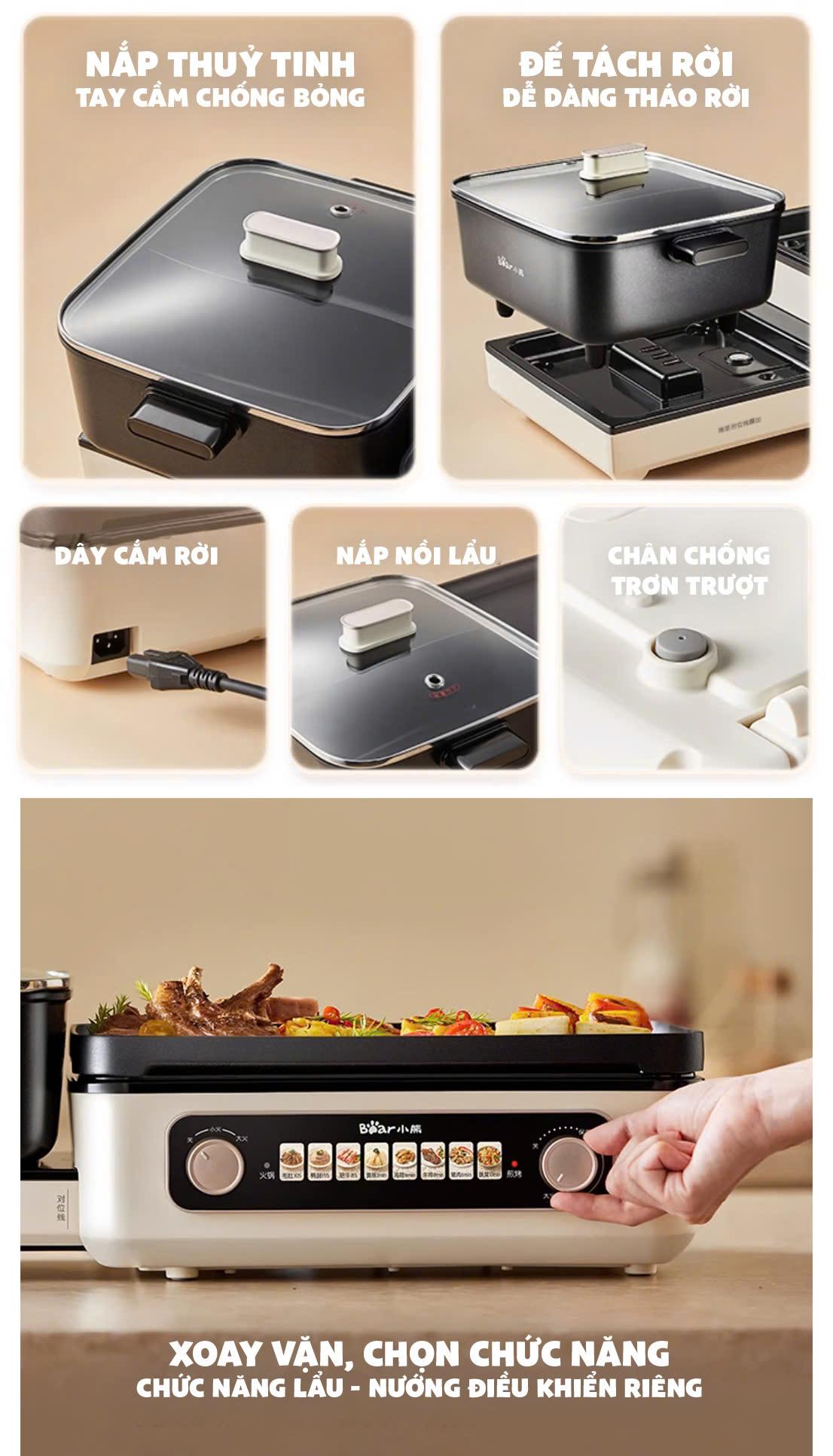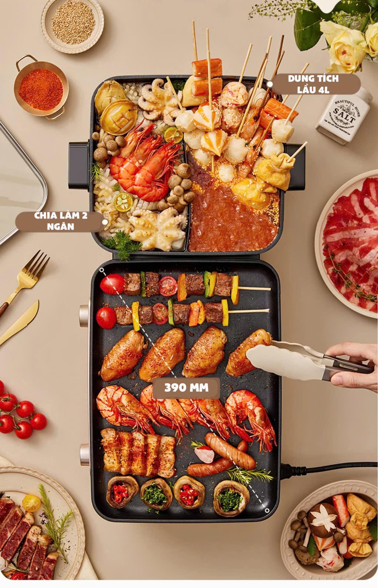 Sản phẩm sở hữu thiết kế ngăn lẩu 4L chia đôi, có thể tháo rời tiện vệ sinh. Bề mặt nướng rộng rãi, chống dính cao cấp, giúp món ăn chín đều, không lo bám dính. Đặc biệt, công tắc điều khiển riêng biệt cho lẩu và nướng, cho phép bạn linh hoạt chế biến đồng thời nhiều món ăn.