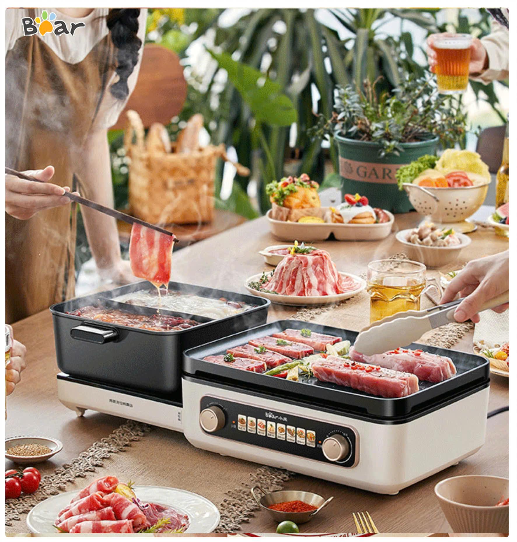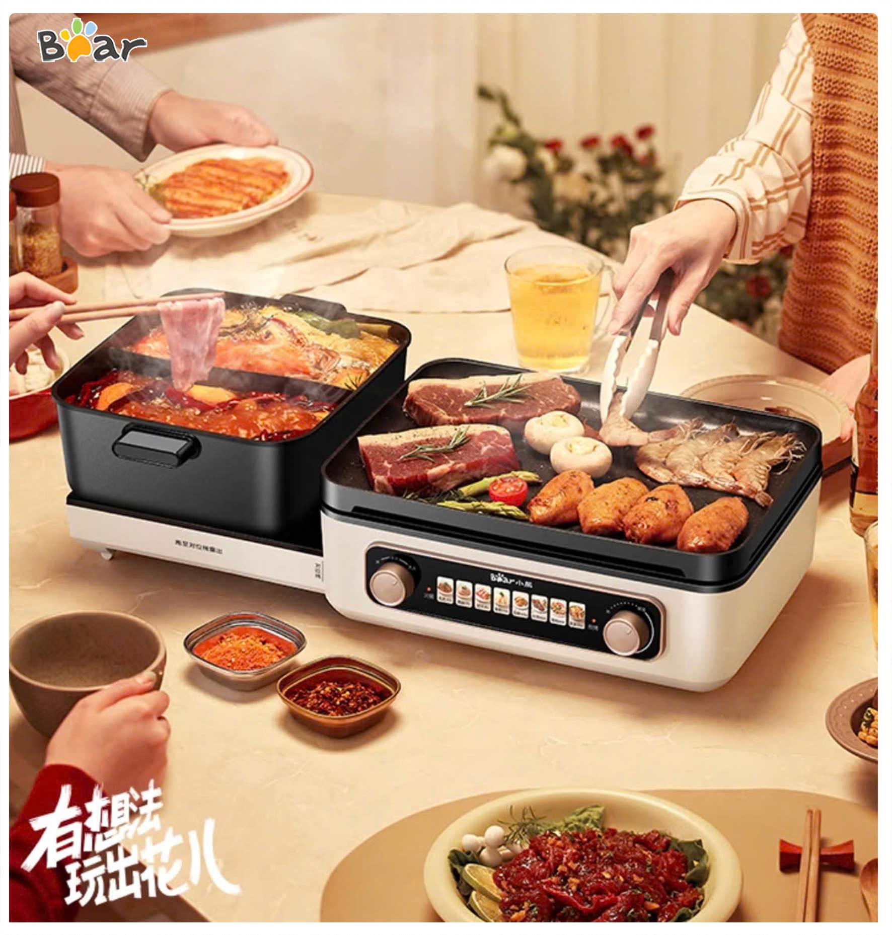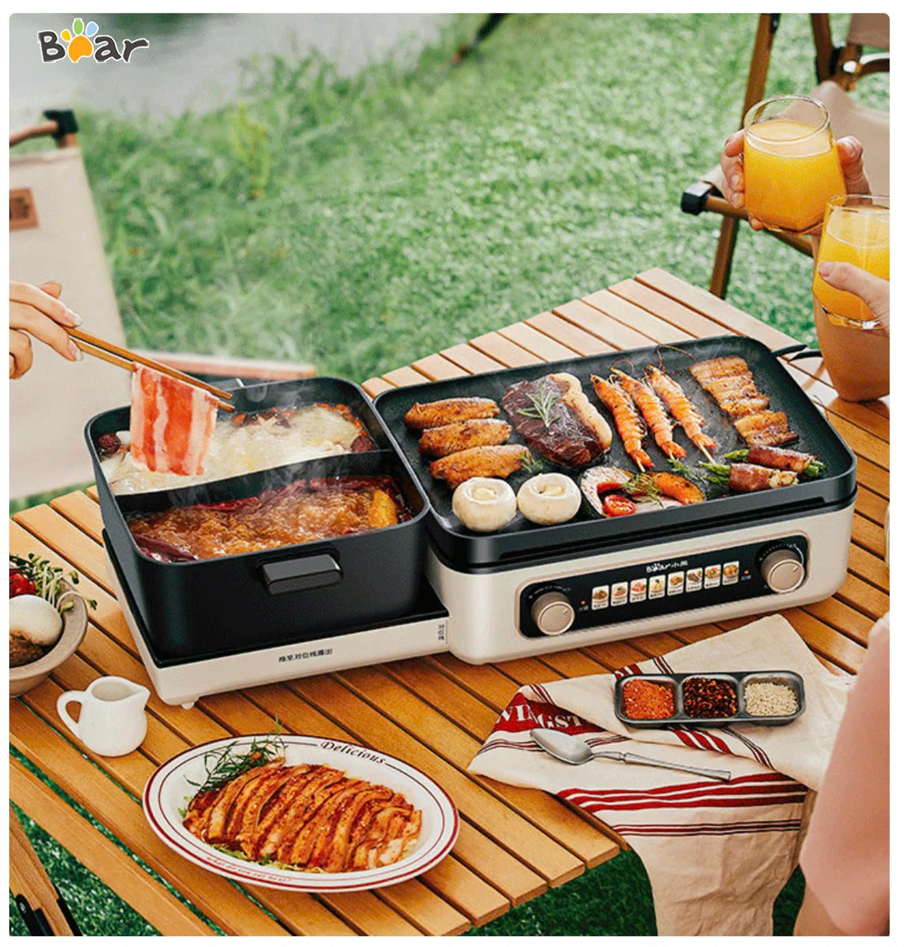 Thưởng thức 2 hương vị lẩu trong 1 lần nấu cùng khả năng nướng thơm ngon ngay tại bàn chỉ với Nồi Lẩu Nướng 2 Ngăn Gấp Gọn Bear GR-5H22R83.